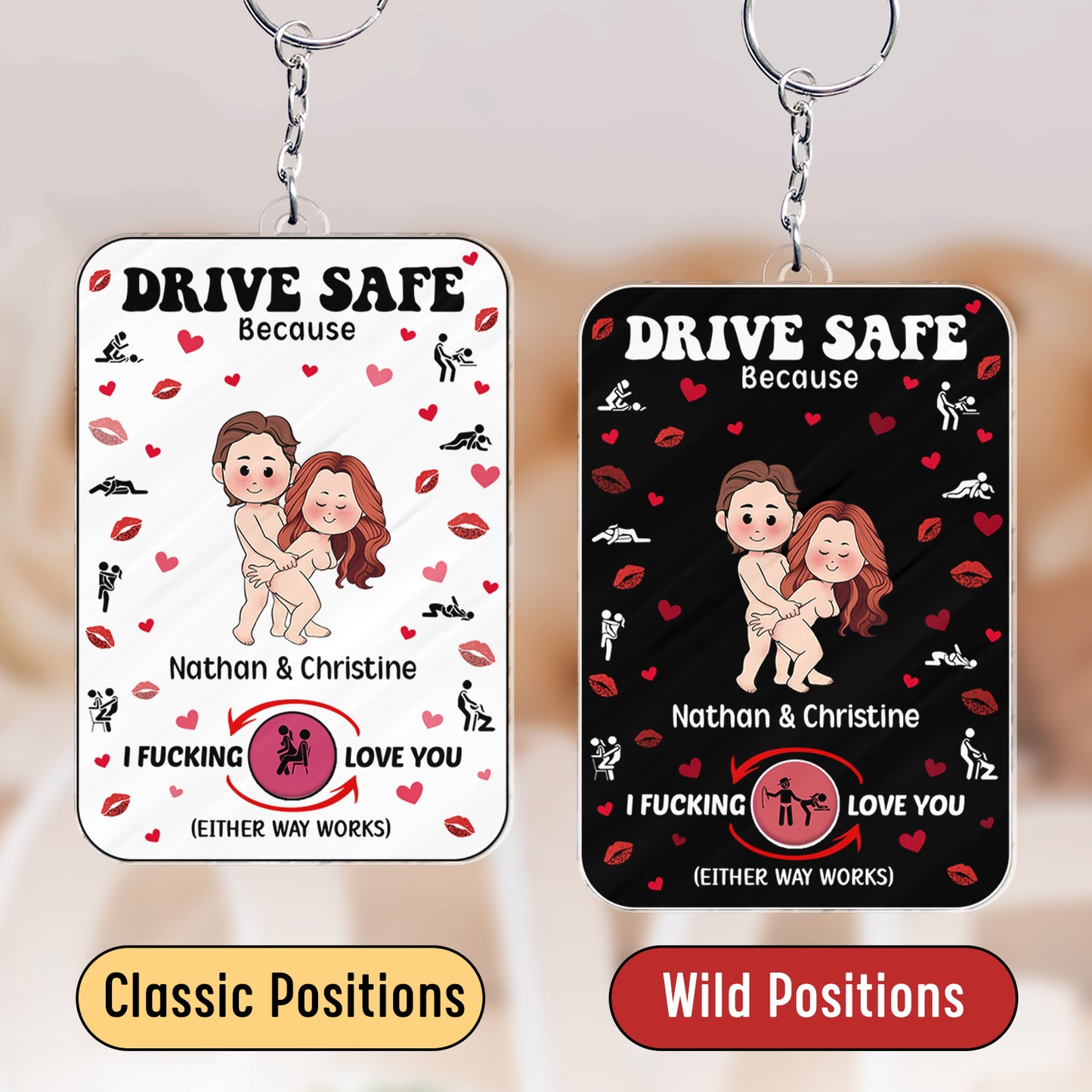 Bring a smile to every drive with this personalized couple car hanger. It features a playful design. You can choose between classic or wild positions for a fun touch. The hanger displays your names and a cheeky message that adds personality to any car interior.