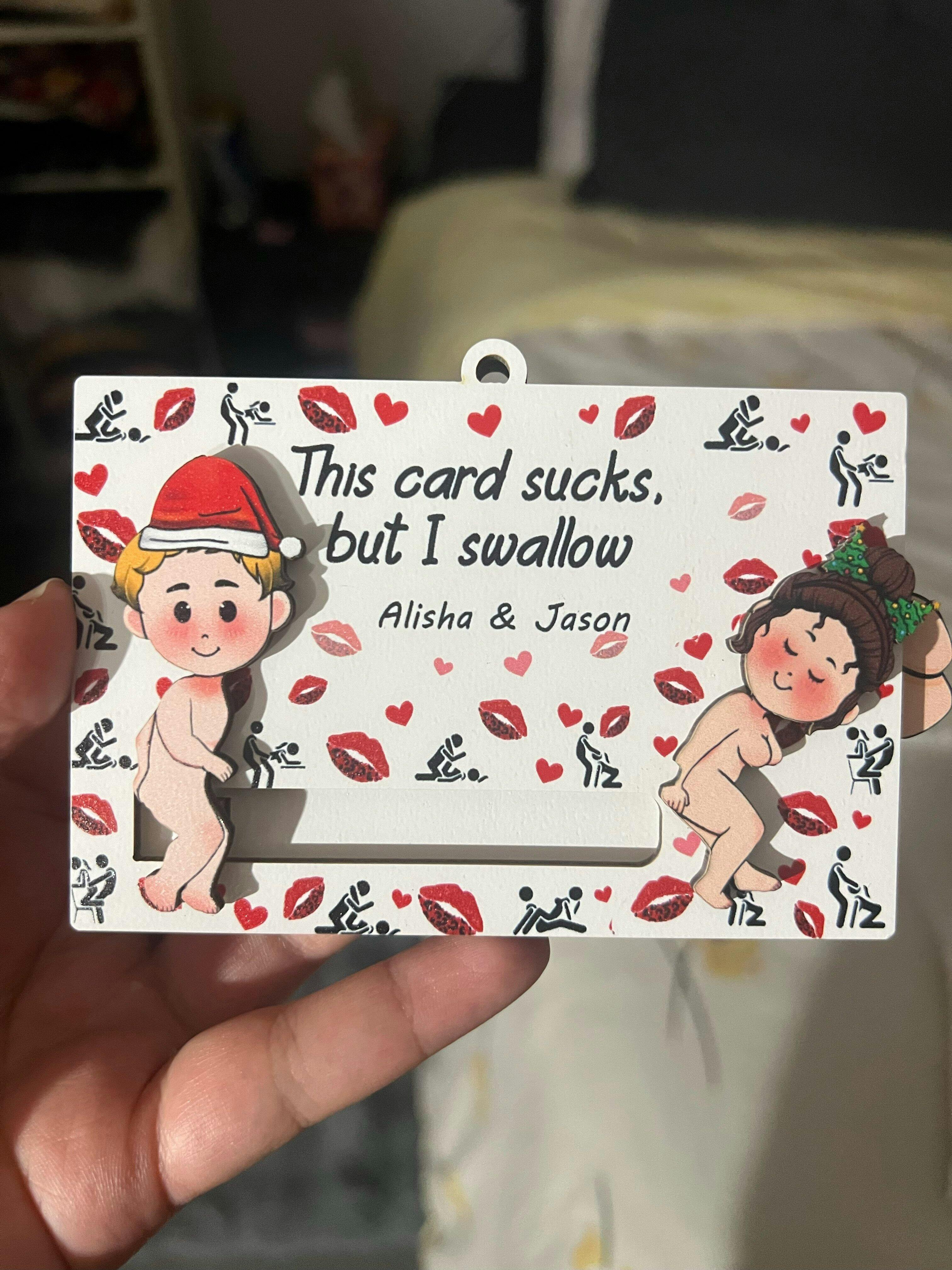 365Gifty personalized couples ornament with humorous message and cute couple figurines on a holiday background