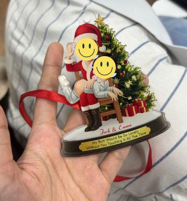 Personalized funny Santa Christmas ornament featuring a custom design with playful humor