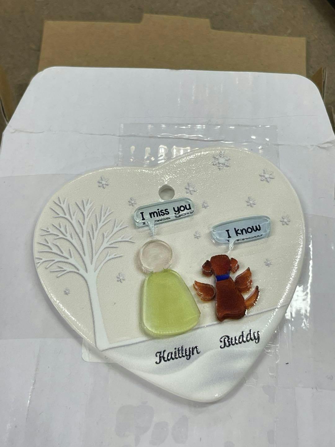 Personalized pet memorial ornament featuring a heart design, with a person and dog saying I miss you and I know